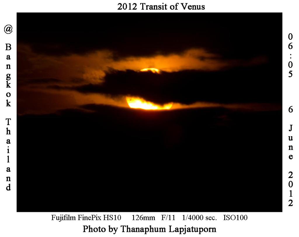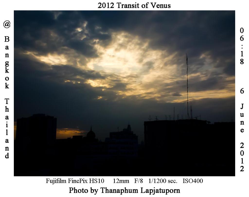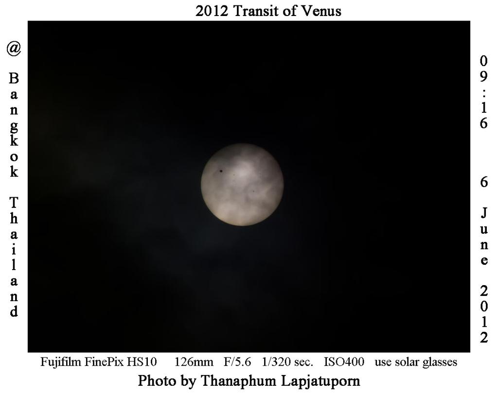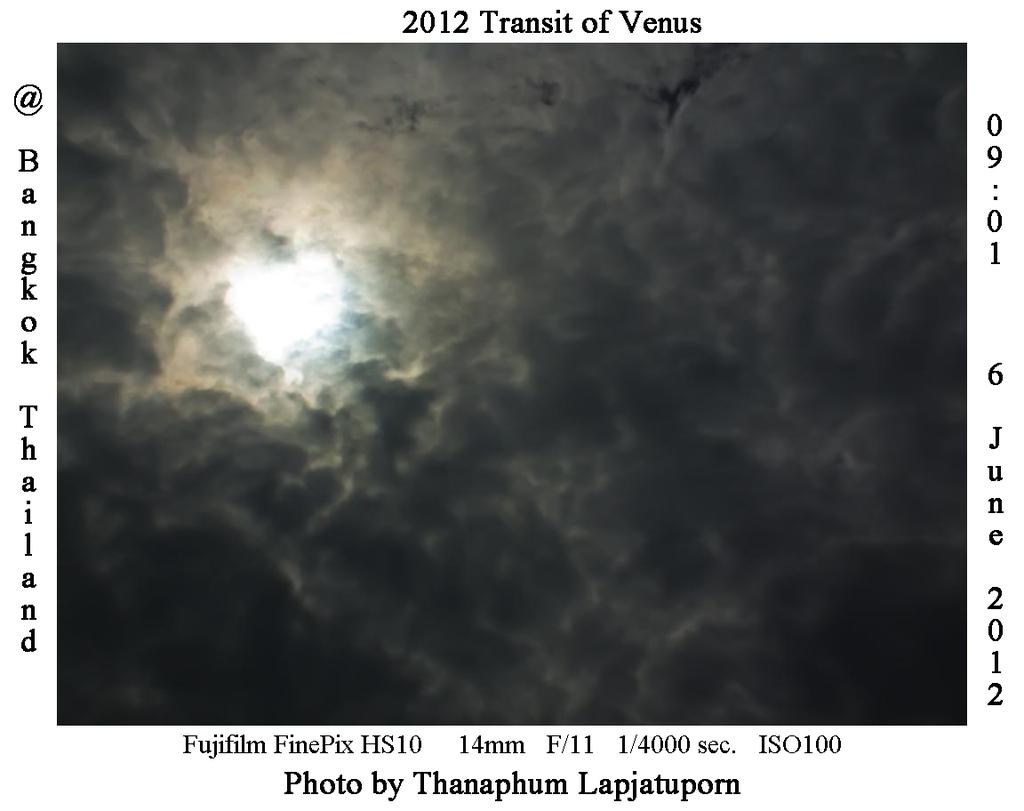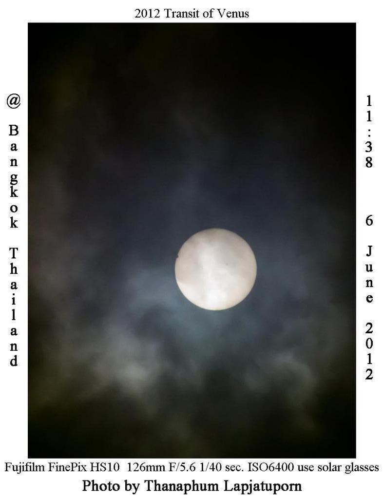ได้เห็นดาวศุกร์ผ่านหน้าดวงอาทิตย์แล้ว! ล่างซ้ายของดวงอาทิตย์ที่เมฆเกือบจะบังไป ได้เห็นอยู่ไม่ถึงนาทีเพราะเมฆเยอะมาก ถ่ายไปสิบรูป มีรูปนี้รูปเดียวที่เมฆไม่บัง